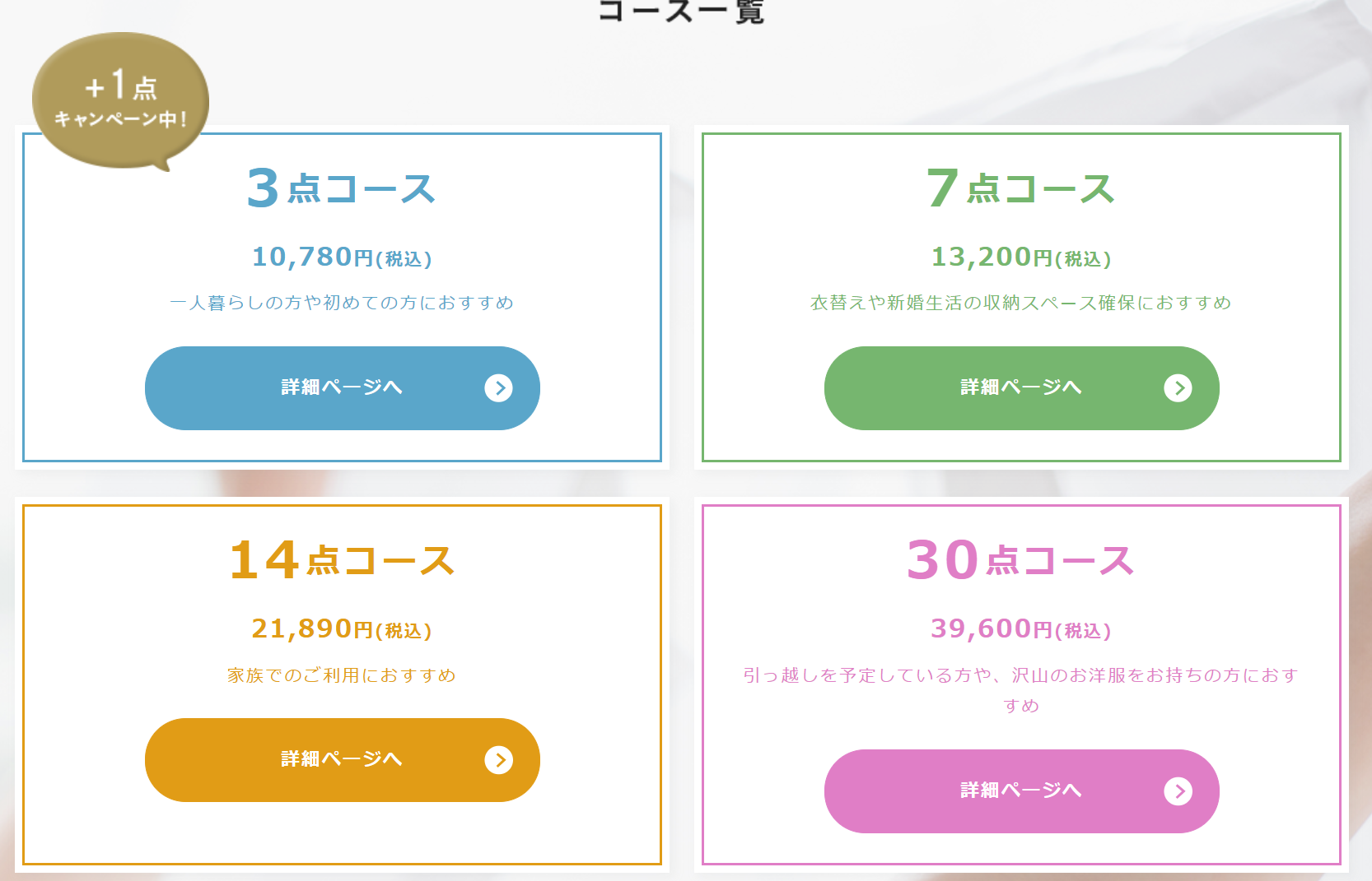 決まったコースを選ぶだけで迷いなし!まとめて出したい場合も対応してくれるのでおうちのクローゼットのメンテに毎年利用するリピーター多し!