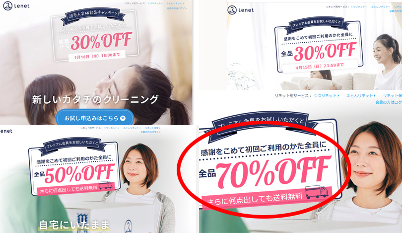 リネットの通常料金は、街のクリーニング屋さんと同じくらいか、モノによっては少し高いかなという感じです。しかし、注目は最大70%OFFなど(※時期によって30%〜)激安で利用する方法があるのです!